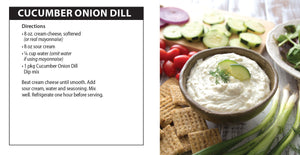 You’ll love the garden-fresh flavor of our Cucumber Onion Dill Dip mix. Just blend with sour cream and cream cheese (or real mayonnaise).