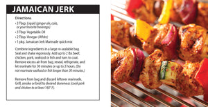 The Jamaican Jerk Marinade blends island spices including lemon, lime, and chilies to marinate chicken, fish, pork, and seafood.